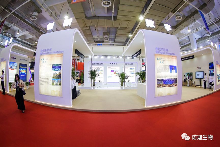 杭州市副市長(zhǎng)胡偉(中)、杭州市投資促進(jìn)局局長(zhǎng)王翀(右)蒞臨諾迦生物展臺(tái)